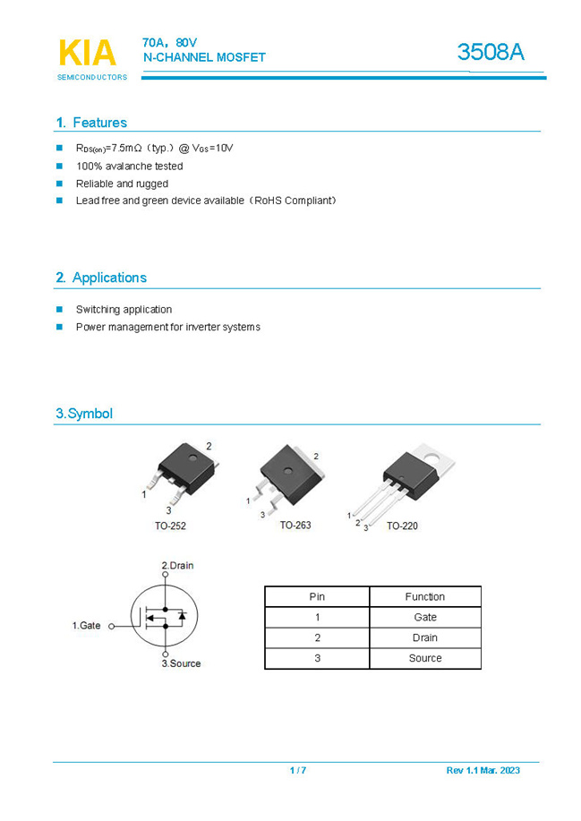 參數(shù): ID(A): 70 BVDSS(V): 80 RDS(ON): 7.5mΩ Qg(nC): 55 Package: TO-252.TO-263.TO-220