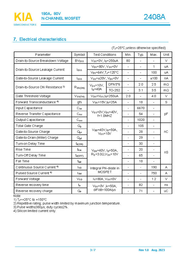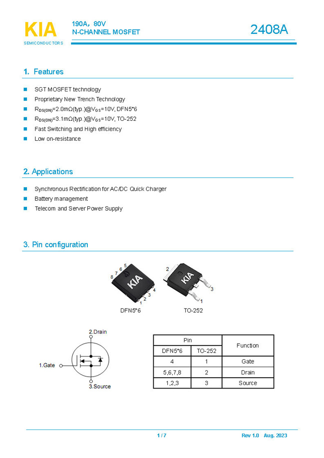 參數(shù): ID(A): 190 BVDSS(V): 80 RDS(ON): 3mΩ Qg(nC): 105 Package: TO-252.DFN5*6