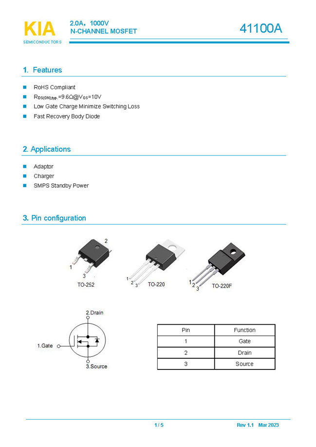 參數(shù): ID(A): 2 BVDSS(V): 1000 RDS(ON): 9.6Ω Qg(nC): 15 Package: TO-252.TO-220.TO-220F