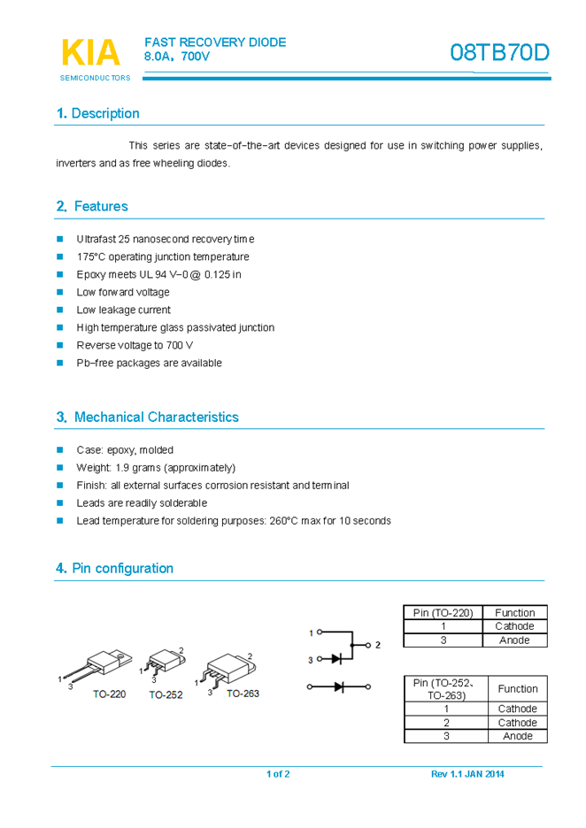 參數(shù): VR(V): 700V IF(A): 8A Trr(ns): 25NS Package: TO-220、252、263