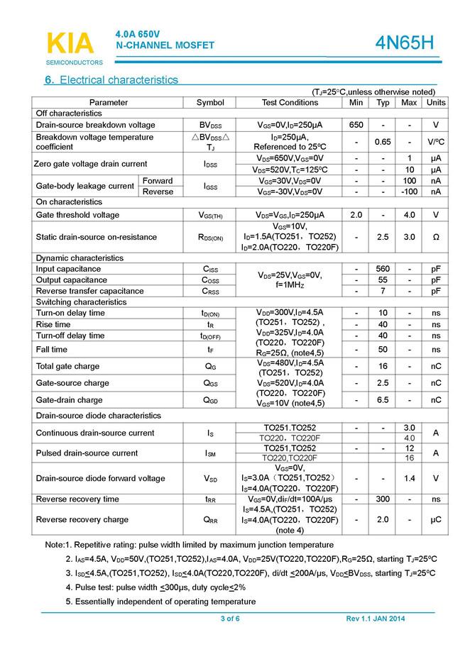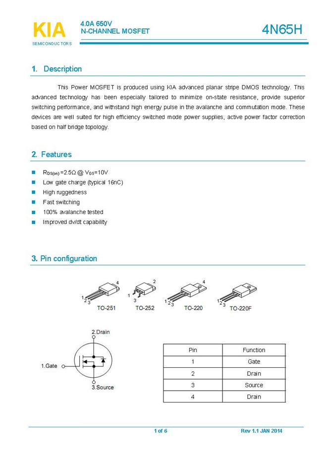 參數(shù): ID(A): 4 BVDSS(V): 650 RDS(ON): 3 Qg(nC): 16 Package: TO-251、TO-252、TO-220、TO-220F